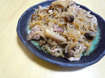 - フライパンを熱してごま油をひき、糸こんにゃく、豚肉を中火で炒める。豚肉に火が通ってきたらしめじを入れる。