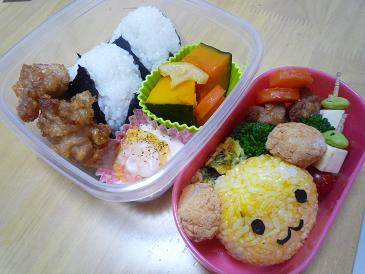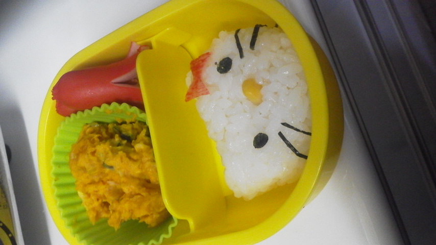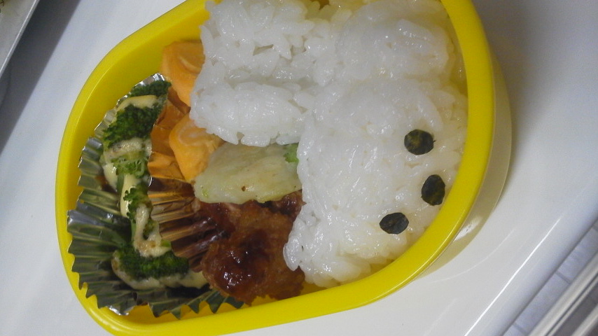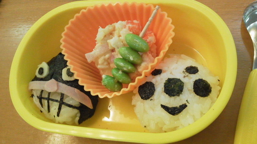 さてさて。スイミングは2時ちょっと前から1時間あるんだけど、お昼を軽めに食べさせといてお弁当を持って行くことが多い。最初はおにぎりだけとかだったけど、来年以降の幼稚園は給食ないとこに行った時のため、少しずつキャラ弁にチャレンジしてる。キャラ弁ってさ、多少手間がかかるだけって思ってたけど、目とか鼻とかをそれっぽく並べるのって結構難しいのね。絵心のない私は、 なんか微妙に変 ってキャラを量産してる。