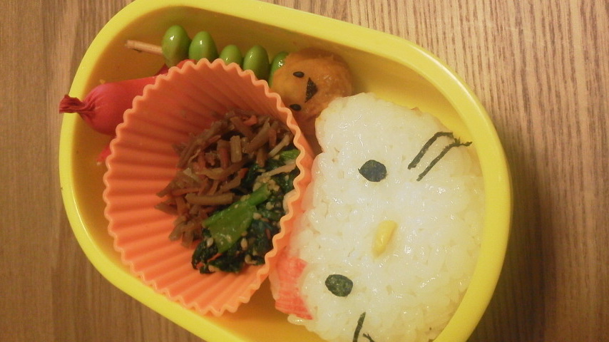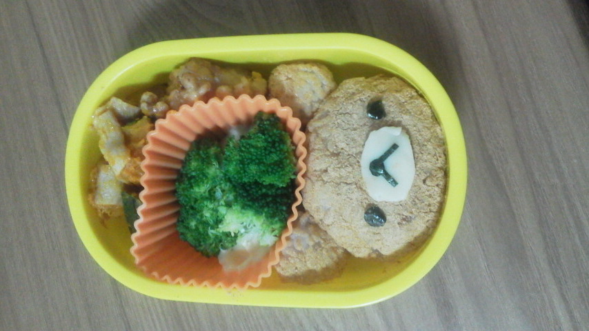 ネットとかで見かける、センス溢れる素敵キャラ弁とは程遠いなぁ・・・。ああいうの作ってキャラ弁ブログとかしてる人達って、料理上手でセンスのある人達なんだという事をしみじみ思った。キャラ物だけじゃなくて、おかずも含めた全体のバランスも素敵だったりするし。あそこまで上手にできないにしても、もうちょっと全体的に華やかなお弁当を作れるようになりたいな。