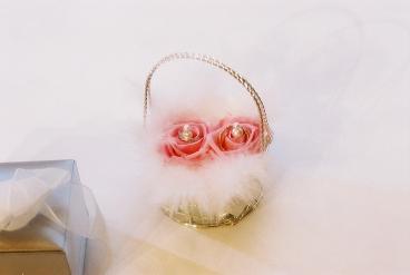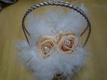 リングピロー、プリザーブドフラワーの色落ちは激しいし羽毛はぐしゃぐしゃ。プリザーブドフラワーってずっと段ボール箱に突っ込んでて日に当たってないのに色落ちするもんなんだね。
