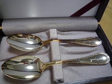 銀のスプーンをリビングに飾ると幸せがどうのとかいう言い伝えに乗っかってるらしい。正直、要らないから安くして欲しかった・・・。3年も経つと銀が錆び始めている。でも名前彫ってあるんで捨てづらいなぁ。かといって、こういうの飾れるようなリビングじゃないし。うーん・・・。