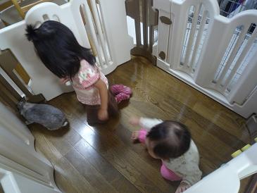 そんな真反対の2人を、ベビーサークルを組み立てて小雪と一緒に入れてみた。ぴょいこら逃げる小雪をぴよさんと一緒に追ううちに長女ちゃんのテンションは上がってきたみたいで、最終的にはなぜかぴよさんと手を繋いで飛び跳ねていた。