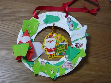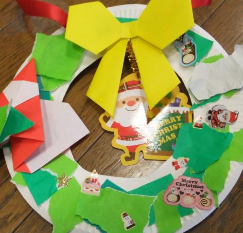 パーツだけ渡されて好きに作っていいって話だったから、リースは緑系の折り紙をペタペタ貼らせて折り紙のサンタを貼った。折り紙サンタは私の力作だったのに、サンタの上にも折り紙を貼るぴよさん。折り紙で黄色いリボンも作ってたのに、完成したのを持ってお友達と走り回ってる間に落とした模様。幻の完成図となった・・・と思ったら、サークルのブログに載ってた。