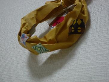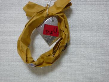 このしめ縄もどき、千代紙を千切って貼りつけるという物。クリスマスリースで似たような事をしたばかりだったから上手く作ってくれるかと思いきや、なぜか見えない場所にばかり千代紙を貼るぴよさん。