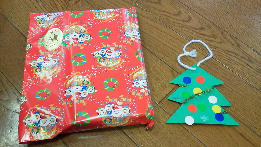その後全員で円座になって、曲に合わせてプレゼントをぐるぐる回して、ゲットしたのは結構大きな包み。