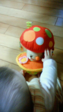 兄は「まだ早い」と言ってたけど、ぴよさんを支えて座らせて目の前に置いてやると興味津々。一心不乱にあちこち掴んでブンブンしたり、舐めたりしていた。