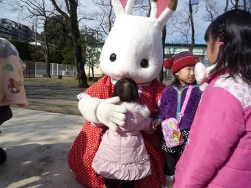 全く同じ耳の柄、同じ服装。ぴよさんも少しは喜ぶか!?と思いきや、「ぴよさんうさぎ」と同じとは認識せず、ただ大きいうさぎがいるからって感じで走り寄った様子。でもまあ、家に帰って手持ちの人形を見せつつ写真を見せればいいかと激写しまくった。