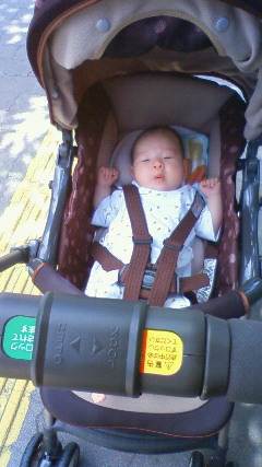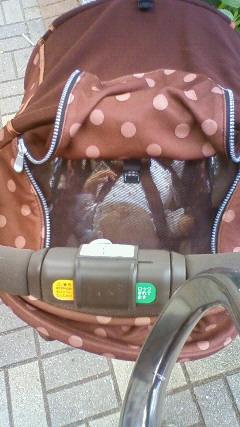 晴天だったから目を細めてた赤さん。夏の炎天下では幌があっても眩しいようだ。やっぱサンシェードいるかなぁ。しかも汗かいてらっしゃる。暑さが本格化する前に・・・と午前中に出掛けたけど、やっぱ暑かったようだ。