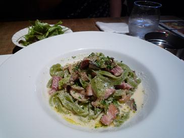 写真撮らせてもらう時パルメザンチーズのいい香りがプンプン漂ってきた。ちなみにここの生パスタは、大名で1,2位を争うおいしさらしい。メニューの脇に書いてあった情報だけど、自分で言ってる事だから間違いないだろう。フェットチーネなのもまた、おいしそう。