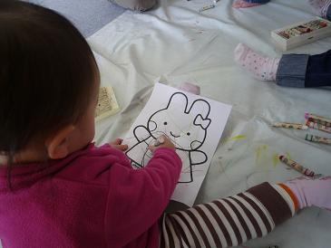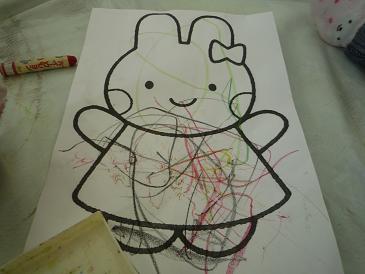 さて今日のメインイベントは、「おえかきをしよう」。用意されたうさぎの絵にクレヨンで自由に色を塗ろう。うさぎのワンピースに柄とか描いても楽しいねって内容。ぴよさんはクレヨンを渡され、即座に真剣な顔になって殴り書きを始めた。
