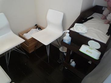 すごくいい授乳スペースってわけじゃないけど、嬉しいお気遣いかな。個室がないお店だとビル内のベビールームまで行かないといけないけど、その必要がないんだから。おしり拭きもオムツを捨てれるゴミ箱もあるし。