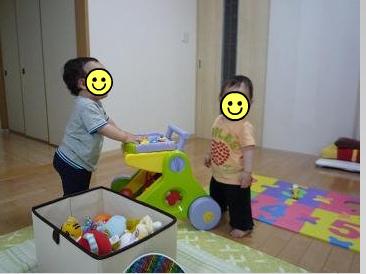 ↑うちにあるのと同じ手押し車なんで自分のと思いこんじゃったぴよさん、Hちゃんが掴まってるのに自分ペースでどんどん動かしてHちゃんを泣かしちゃったの図。「あたしはまだ、そんなに早く歩けないの~」ってとこか。ごめんね、Hちゃん。