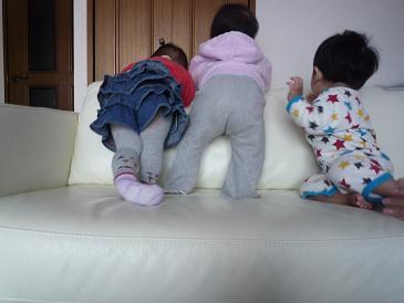 3人ともソファーと壁の間の隙間を覗き込んだりして、ずーっとこの状態だった。Aちゃんに至っては脚を曲げたり伸ばしたりして、まるで音楽に乗ってるかのようなはしゃぎっぷり。毎日見てるソファーなんだろうけど、お友達と一緒に乗ったら楽しかったのかなぁ。