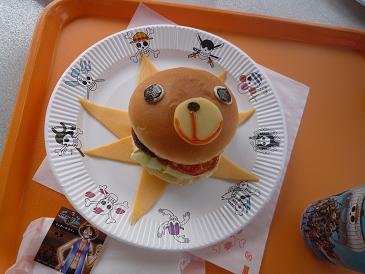 平日だから人は少ないかと思ってたけど、修学旅行生っぽい子供達がたくさんいる。父親は若干居心地悪そうだったけど、外にテーブルと椅子があるのを見付けてそこで食べることにする。そのハンバーガーショップで私はルフィをイメージしたらしい肉肉しいハンバーガー、妹はサウザンドサニー号をイメージしたらしいチーズバーガーを注文した。