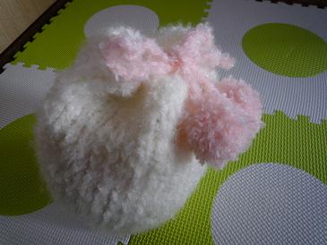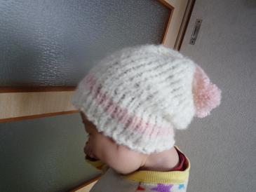 編み図なし、完成予想図は頭の中におぼろげにあるだけ、伸びゲージも計らず作り始めたんで、帽子は何度も編み直した。完成近くまで編んでおいてサイズが合わない事に気付いて解いた事も2回ほど。おかげでこんなシンプルな物に1週間以上かかってしまった。さて、お昼寝から起きたぴよさんに被せてみる。