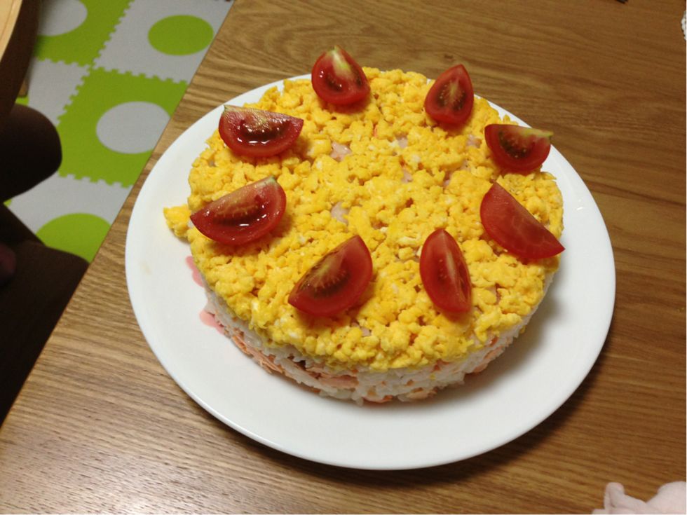 旦那サンの帰りも遅いし、タロさん抑え込みつつ2人で食べるのもね~・・・。というわけで、ケーキは止めて押し寿司ケーキを作った。私の葛藤を知らないぴよさん、大喜び。