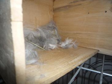 こんな。もーね、フッカフカの上質ラビット毛皮がこんもりと。うさぎの毛って軽いから、片付けると部屋中にフワッフワ毛が舞うから大変なんだよね・・・。小雪は妊娠初期(と思い込んでる)状態で気が荒くなってるから、ケージの掃除しようとすると攻撃してくるし。