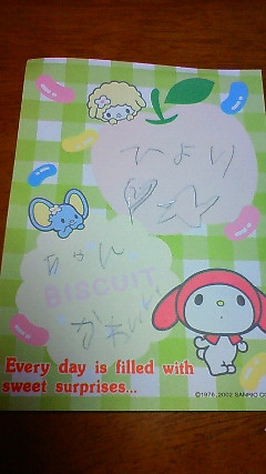 夕食後、母が兄宅へ行くって言うんで私も一緒に行った。まだ夕食中だった姪達は大喜び。姪その2は赤ちゃんが大好き。当然ぴよさんも大好き。このしょうゆ顔が好きで好きでたまらないらしく散々愛でたうえに、隅の方でこっそり手紙を書いて持ってきた。