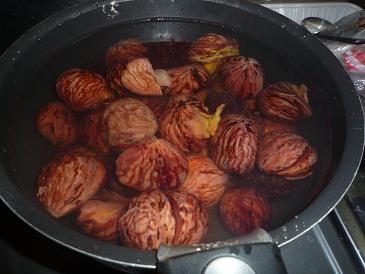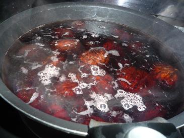 アクが抜けた栗がグロくて何か嫌。しかも私の扱いが雑なせいで、さっそく何個か煮崩れてやがる。これに少しずつ砂糖を加えて煮詰めていく。冷蔵庫に旦那サンの飲みかけ赤ワインが長い事放置されてたんで、少し入れてみた。