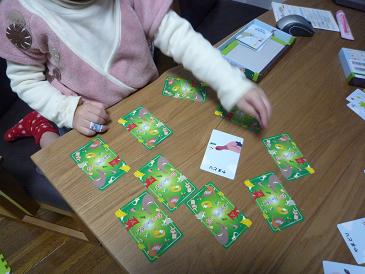 2枚開いて揃ってなかったら伏せるっていう神経衰弱のルールを教えるのに、若干手間取った。2つ絵柄を揃えるっていうのはすぐわかったっぽいけど、1枚目と2枚目が違ったらさっさと2枚目伏せて別のを開くというズルを多発。頭ごなしに否定もできず、内心