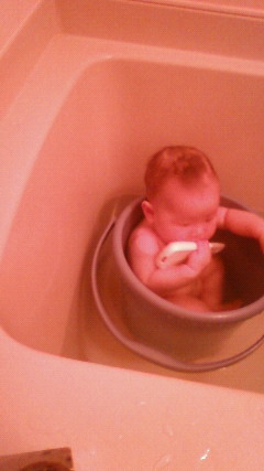 首は据わったけど腰は据わってないぴよさんだけど、バケツの側面に体を預ければ何とかなるんじゃないか?とりあえずやってみようと、お湯を溜めたお風呂にバケツを沈める。そこへ、はだかんぼのぴよさんを投入!