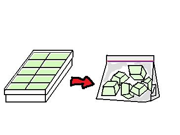 離乳食のための食材を茹でてからすり潰して、お湯で伸ばして蓋つきの製氷皿に分け入れる。それを凍らせ、ジップロックに入れて冷凍保存。