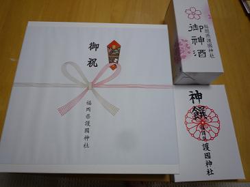 お宮参りって本来氏神にするものらしいけど、行ったのは護国神社。氏神じゃないよね・・・。まあ、英霊達が守ってくださるだろう。料金は5000円なんだけど、お土産ですと渡された紙袋には色々入っていた。