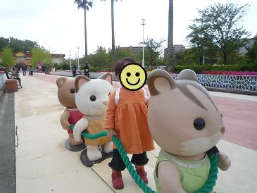 さて私とぴよさん、初かしいかえん。コンセプトはシルバニアガーデンらしくて、あちこちにシルバニアファミリーの動物が点在する。ぴよさんは始めはテケテケ歩いてただけだけど、自分の身長より大きいうさぎを発見した時からテンションが上がり始めた。
