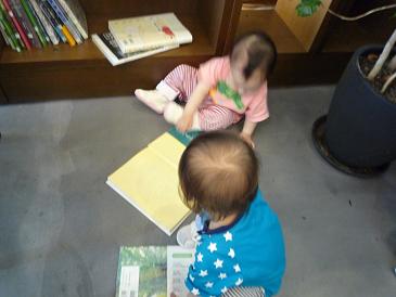 スタバ内の本棚から本を取って、ケンくんと一緒に見たり、奪い合ったり・・・。本といっても絵本じゃなくて『森の本』とか渋い感じのやつばっかなんだけど、何が楽しいんだろうか。まあ、本が好きで何より。こーくんはちょっと離れた席でぴよさん達をじっと見てたけど、一緒に遊ぼうとはしない。でも、じーっと見てる。