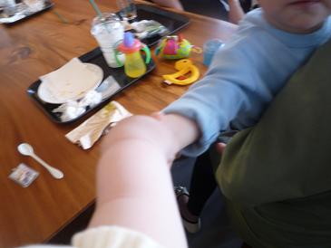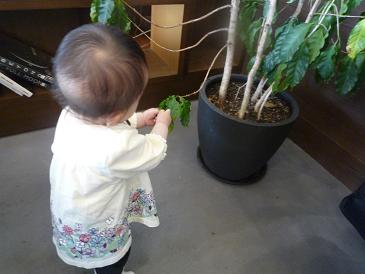 ゆったりと座っておしゃべりタイム・・・といきたいとこだったんだけど、ぴよさんは初めての場所で好奇心を刺激されまくったらしい。一時も大人しくしていることがない。抱っこしてたら暴れるんで靴を履かせて床に降ろしたら、トコトコ歩いて行って知らないおばさん達に絡む。観葉植物の葉っぱをむしる。ゴミを拾って食べようとしている。あの手この手で私の膝の上に留めようとしたんだけど、すぐに飽きてしまう。Kさん、Tさんが息子ちゃん達のおもちゃを貸してくれて、ようやく少しは落ち着いた。