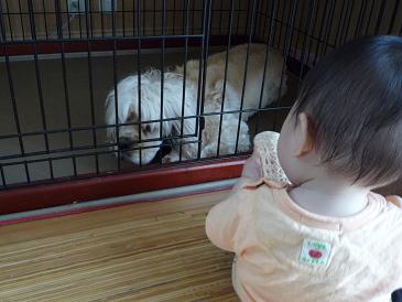 電車の中でかなり寝たうえ、実家に着いたら私の母に遊んでもらってハイテンションになったせいで、夜は2時頃まで元気いっぱいだったぴよさん。朝は母子共にかなり寝坊した。起きて1階に降りるなり、実家のおバカ犬レオンちゃんに吠えられてぴよさんはパチクリ。小雪はあんな大きな声出さないもんねー。