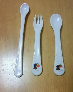 と言ってもまだまだ自分じゃ食べれないんで、使ったのは食べさせる用の左のスプーンだけなんだけど。本当はもっと持ちやすさ重視のスプーンとフォークを買いたかったんだけど、べビザらスで見たらそういうのはぜーんぶ中国産。国産物はこういうキャラクター物ばっかりだった。口に入れる物はやっぱりMade in Chinaは極力避けたいんで、形的には変哲のないスプーンとフォークになってしまった。