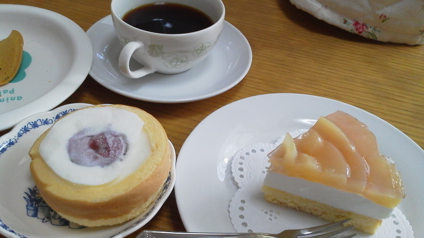 pたんさんは、桃とヨーグルトムースのケーキ。桃を花弁のように並べるケーキ、レシピは見た事あるけど作ろうと思ったことすらなかったケーキだ。まさかよそ様が作って食べさせてくれるとは、ラッキー♪